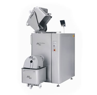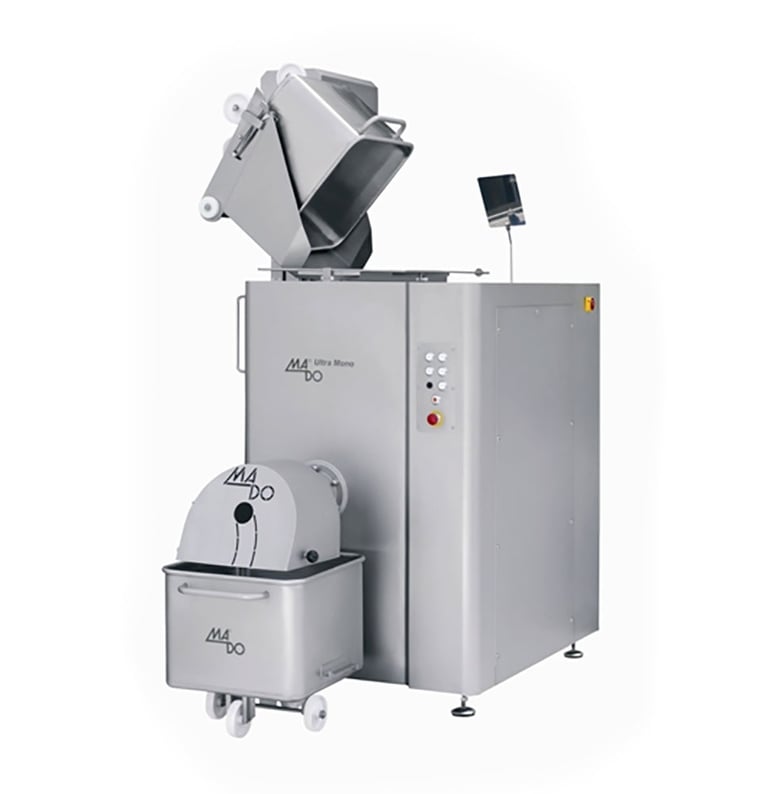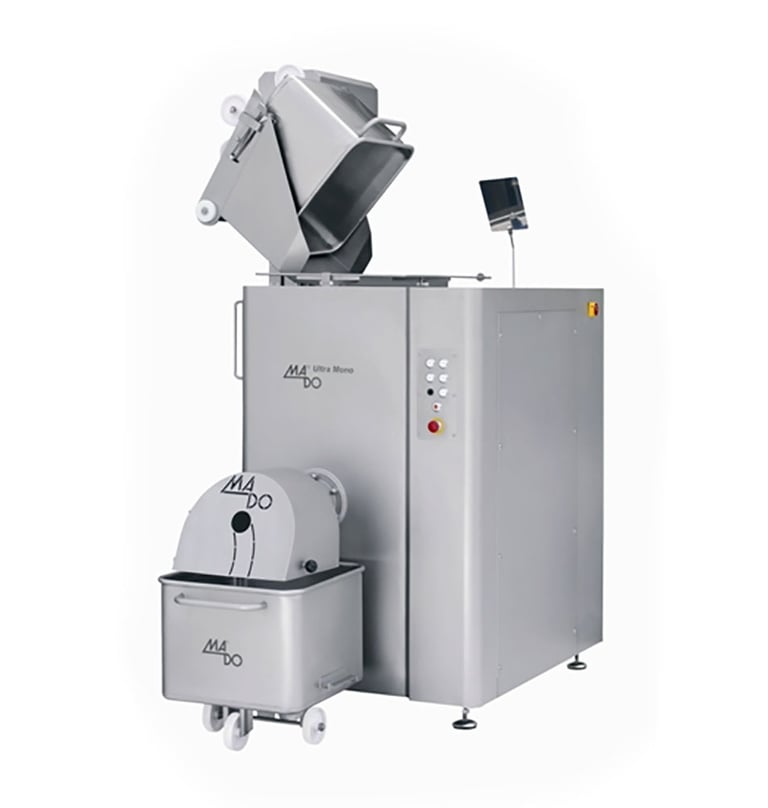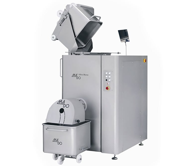 Complete with mixing arm, cutting set 5 pcs. Unger U200 with sickle ring knives, stainless steel disks and 2 spacer rings, electrically locked retractable cleaning platform, including lifting device, mirror, tool carriage, electrically locked finger guard at outlet, hydraulic pusher for worm and 1000 liters hopper volume.